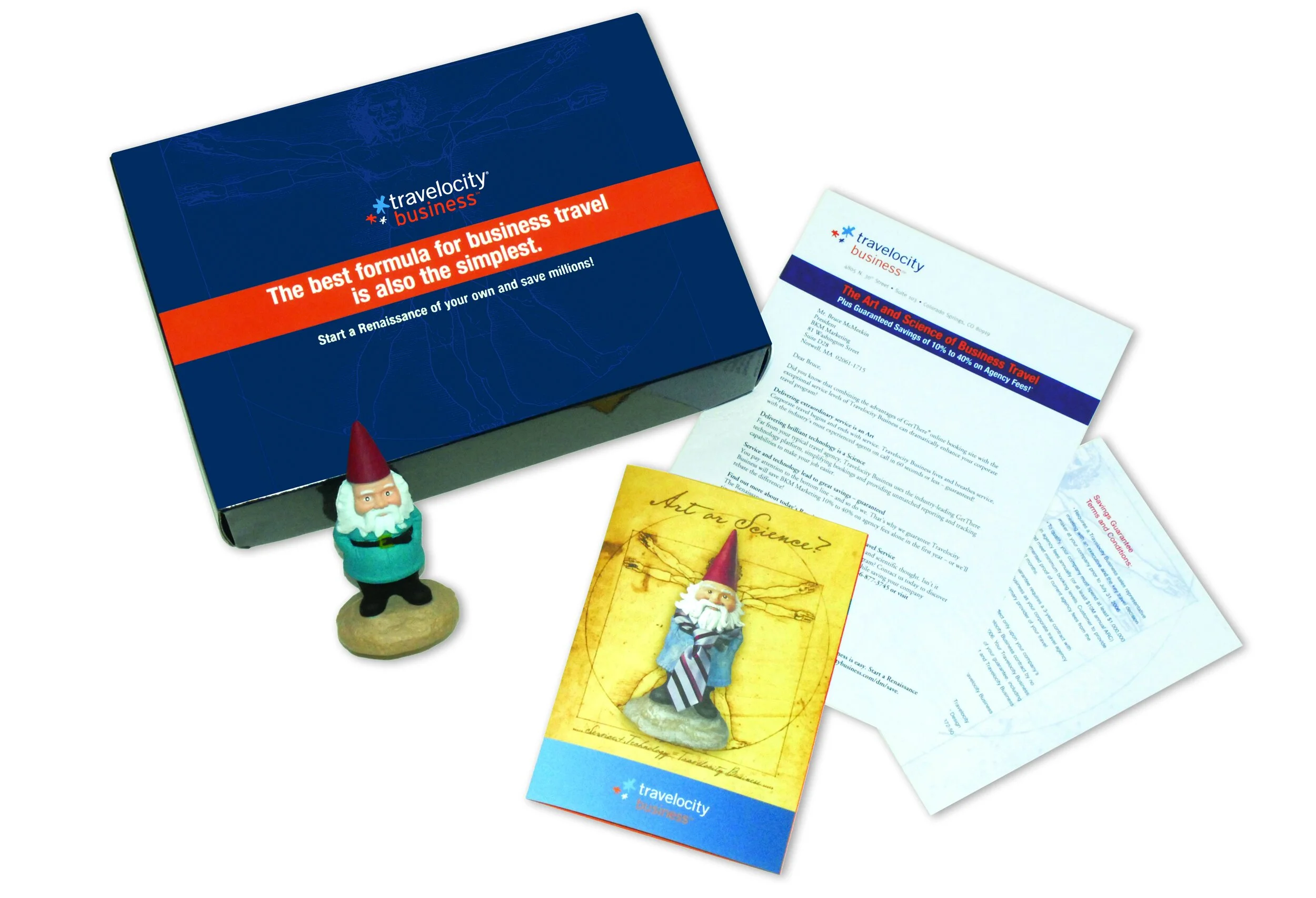 Travelocity Business wanted to expand its corporate client base. Changing meeting dates, teams of people traveling from different places, and fluctuating airline prices and promotions are just some of the challenges facing travel managers. This award-winning “Art or Science” campaign tied into their roaming gnome campaign, was sent to mid-level travel managers.
